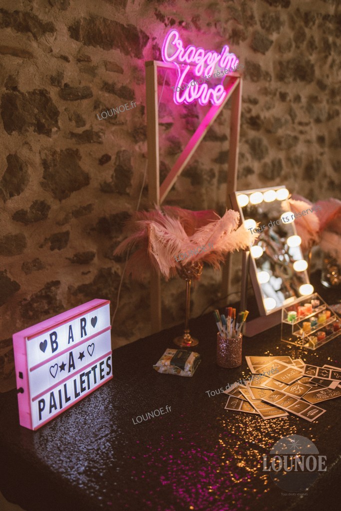 Bar à paillettes : présentoir, paillettes, tattoo, plumes, nappe sequin et panneaux lumineux – 150€